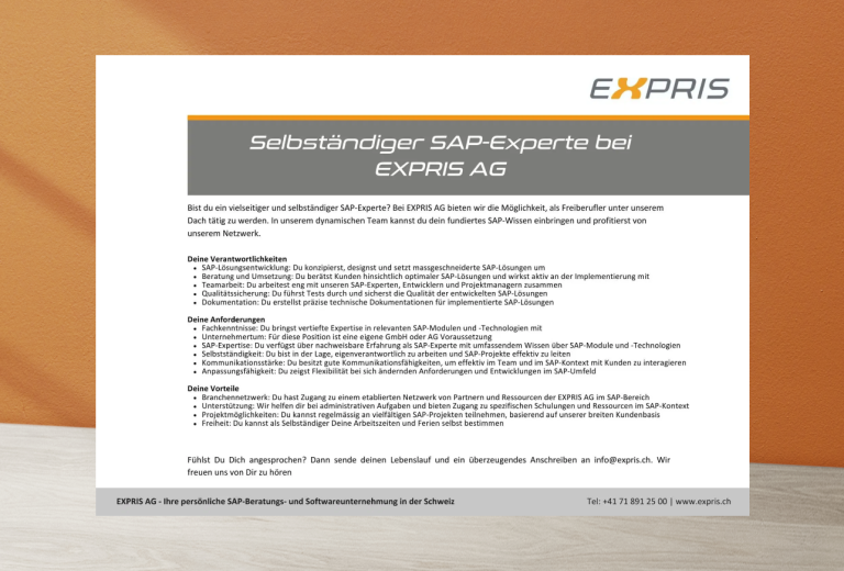 Bei EXPRIS AG bieten wir die Möglichkeit, als Freiberufler unter unserem Dach tätig zu werden. In unserem dynamischen Team kannst du dein fundiertes SAP-Wissen einbringen und profitierst von unserem Netzwerk.